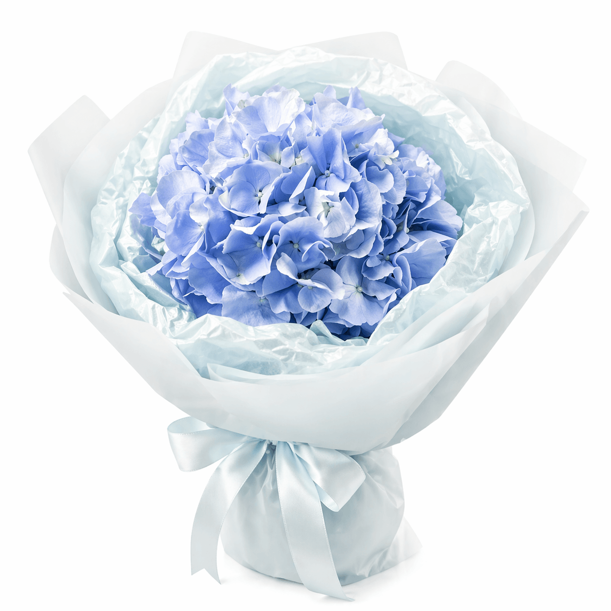 The “Blue Sky” bouquet is a stylish and fresh arrangement featuring a blue hydrangea that symbolizes lightness, harmony, and sincere emotions. The voluminous hydrangea bloom combined with monochrome blue wrapping creates a striking and modern look, perfect for gifting.