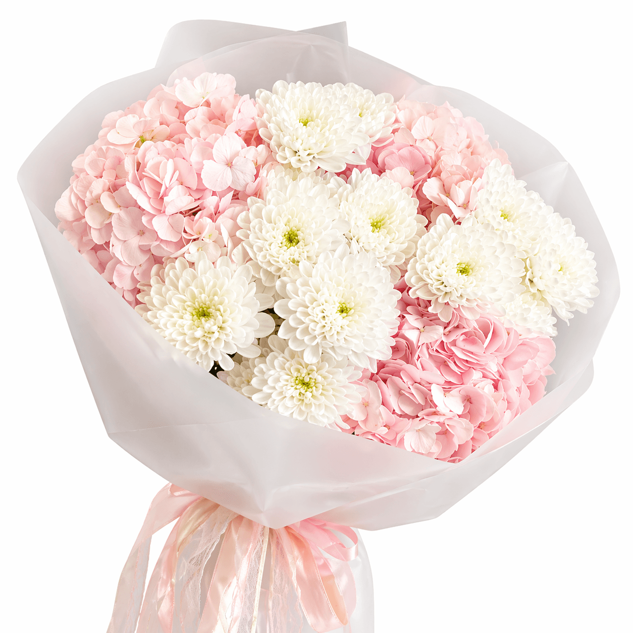 A mix of delicate hydrangea and spray chrysanthemum is a harmonious bouquet that combines the airy volume of hydrangea with the refined texture of spray chrysanthemum. The composition looks full, soft, and elegant, making it suitable both for romantic gifting and for a thoughtful business gesture.