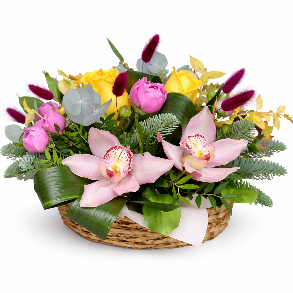 Состав: цимбидиум — 2 шт, кустовые розы — 3 шт, розы пени Лейнстера — 3 шт, итальянский рускус, Альстромерия — 2 шт, нобилис, флористическая зелень