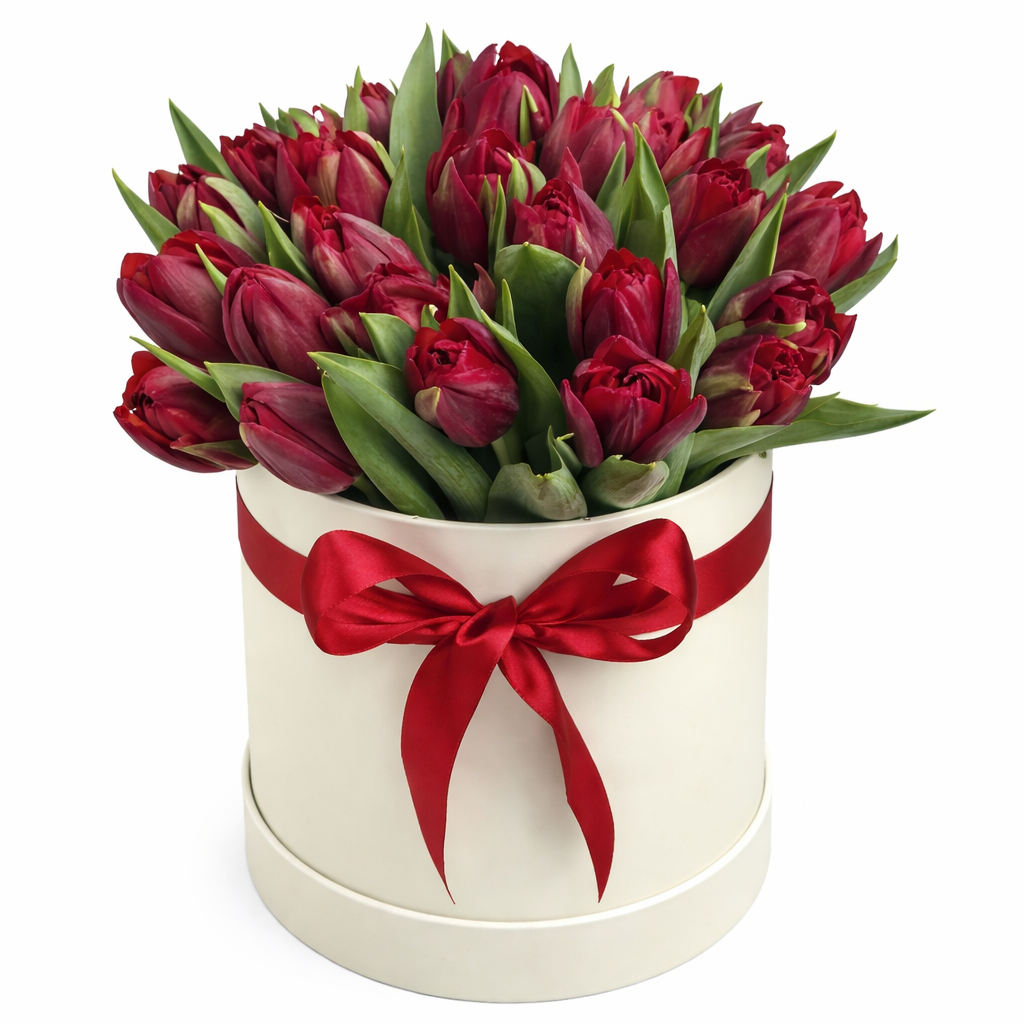 Состав: тюльпан — 21 шт, коробка, оазис