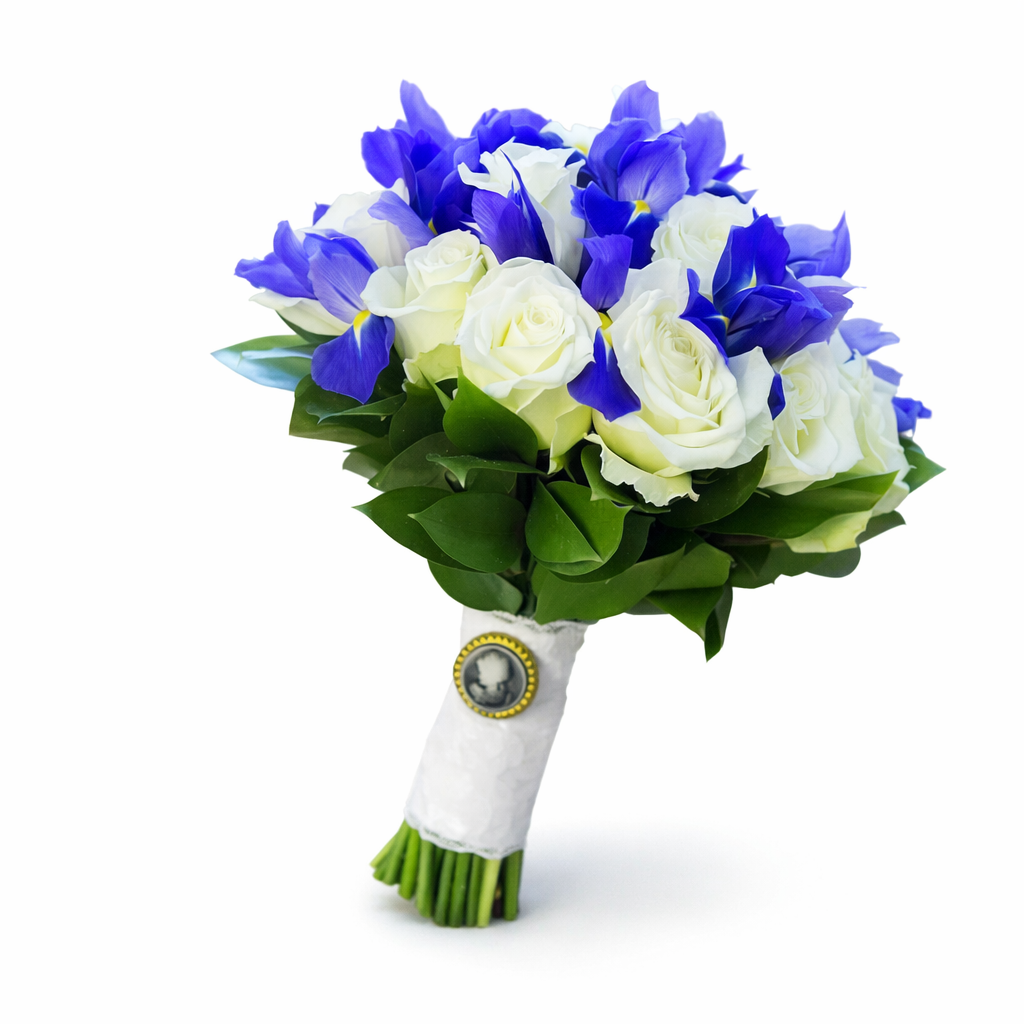 Свадебный букет из белой розы и ирисов представляет из себя необычное сочетание белого и синего цвета.