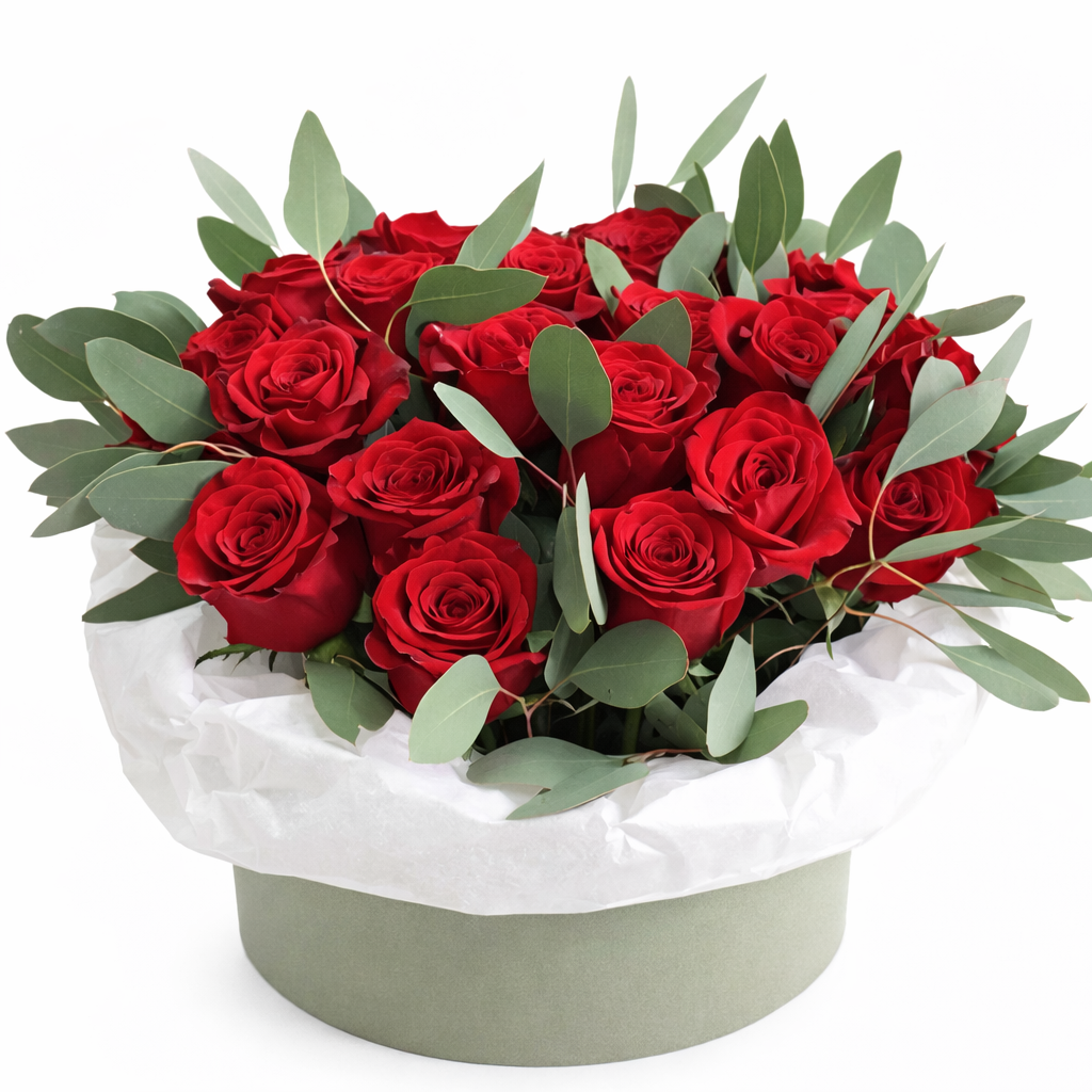 Состав: роза — 19 шт, эвкалипт, коробка круглая, оазис