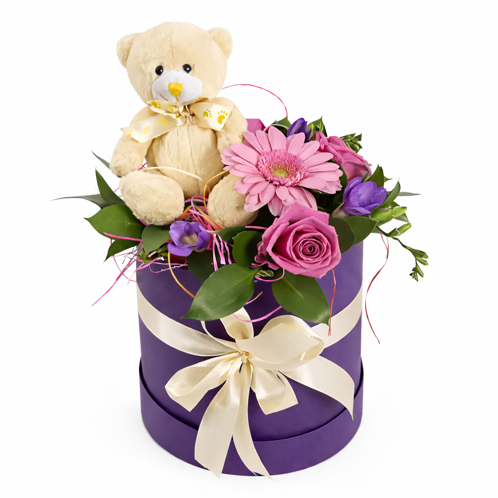 Состав: Роза , Гербера мини , Фрезия , Рускус , Мишка в ассортименте (15 см) — 1 шт, Коробка круглая