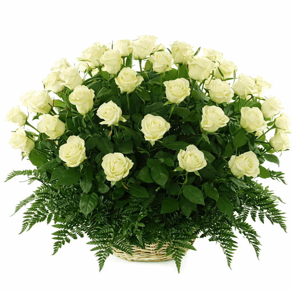 Корзина белых роз — эффектный подарок в честь свадьбы или любого другого памятного события
