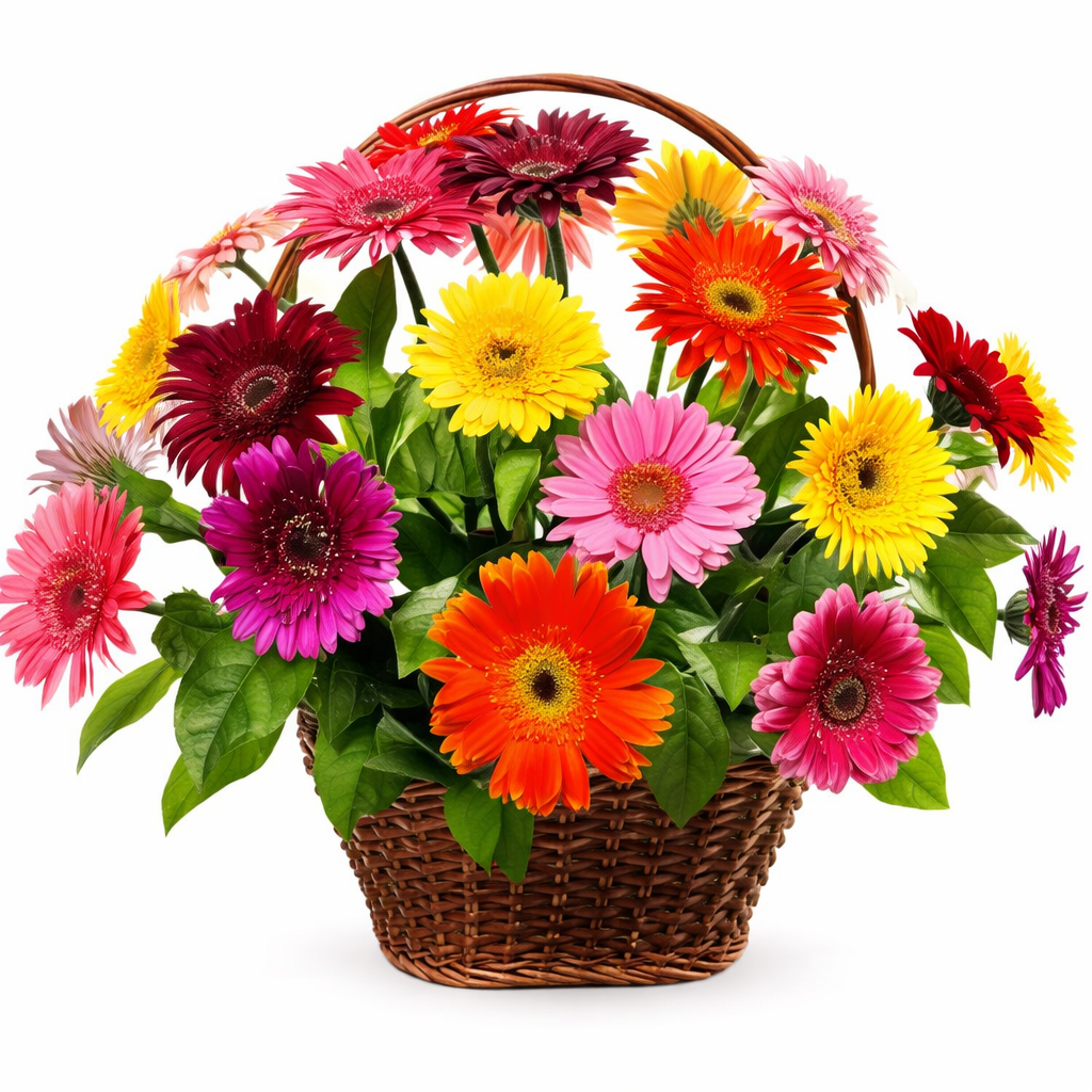 Гербера — 25 шт, оазис, флористическая зелень, корзина