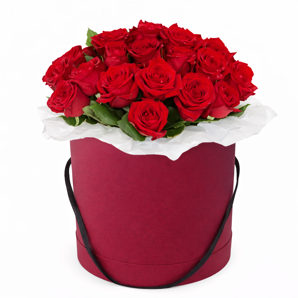Состав букета: розы  — 31 шт, флористическая губка, шляпная коробка, декор