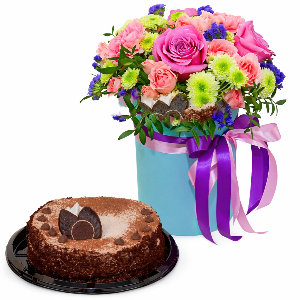 Склад: троянда, хризантема, гвоздика, троянда кущова, фісташка, оазис, капелюшна коробка, атласна стрічка, смачний торт