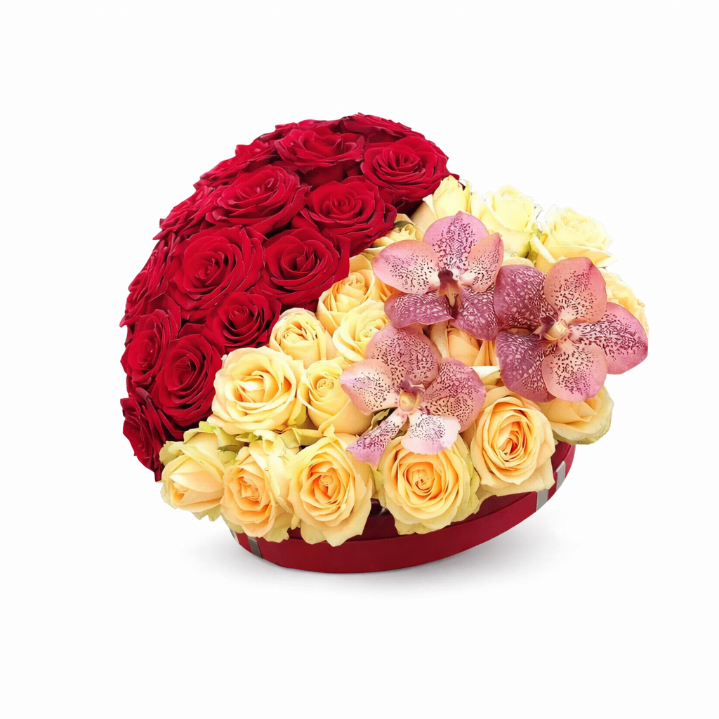 Склад: троянди піч аваланч – 25 шт, троянди гран при – 26 шт, ванда – 3 шт, флористичний матеріал, капелюшна коробка